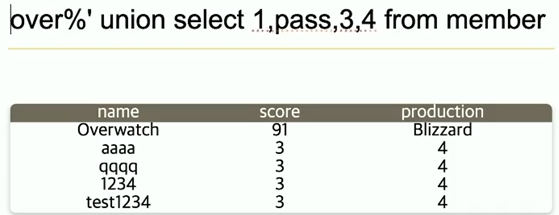 over%’ union select 1,databass(),3,4 # (이렇게 할 수 있다)