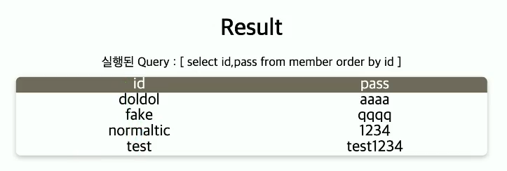 select id,pass from member union select id from member 이렇게 하면 컬럼 개수가 안 맞아 오류가 남