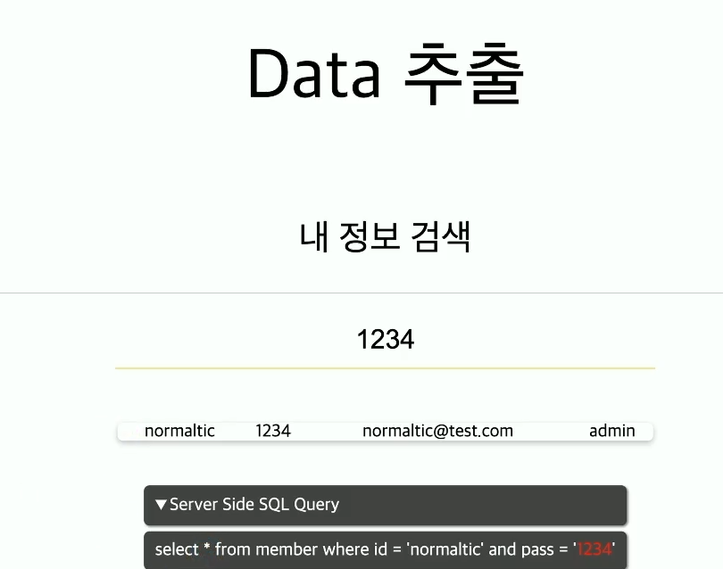 우리는 SQL언어를 변경할 수 있으니 누구의 비밀번호를 보여워 이런 식으로 할 수 있다. 이런 원리를 이용하여 데이터를 화면에 출력하여 빼내는 것이다.